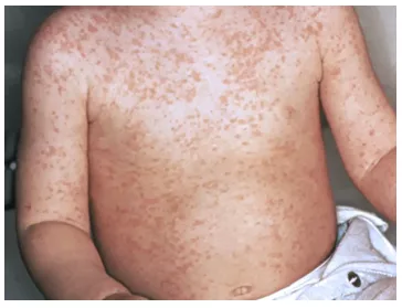 • A rash that begins on the face, upper neck, and behind the ears, then spreads downward across the body to the arms, hands, legs, and feet (refer to the image below). After approximately five days, the rash diminishes in the same order it appeared.