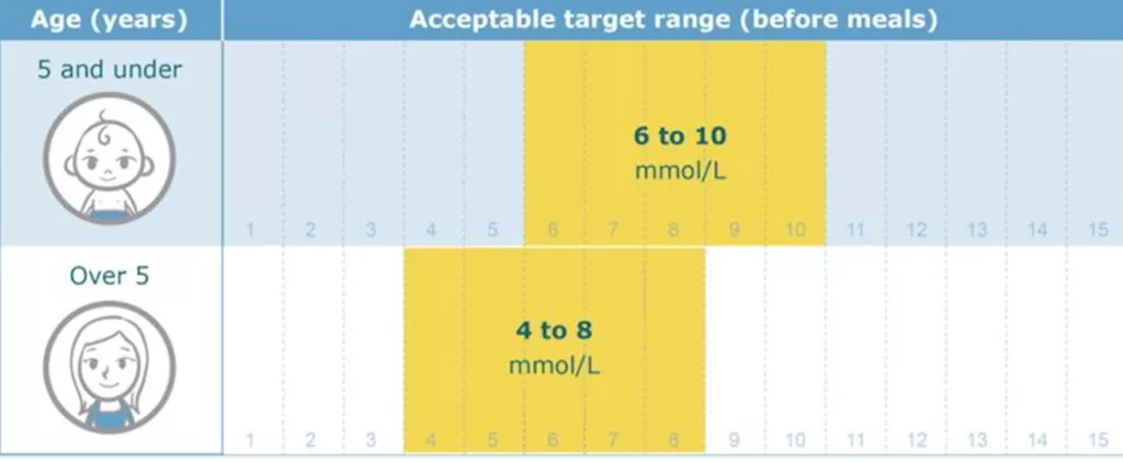 For most school-aged children (over 5 years of age), a low blood sugar is a level lower than 4.0 mmol/L. This level may be individualized based on a child’s developmental level and/or cognitive ability to recognize low blood sugar symptoms. This would be outlined in the child’s diabetes management plan.