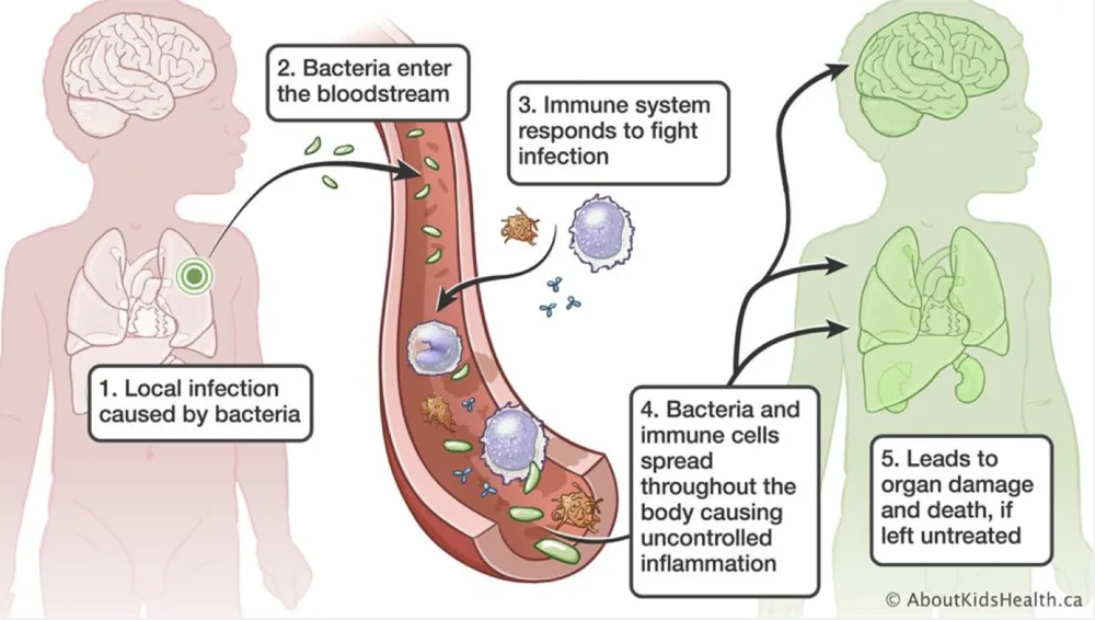 Sepsis is most often caused by bacteria but can also be caused by viral or fungal infections. If a local infection (skin, urinary tract, lungs) enters the bloodstream, the infection can spread throughout the body causing the immune system to release antibodies to fight the infection. This inflammatory response leads to tissue damage and interferes with blood flow. The change in blood flow can lead to a dangerous drop in blood pressure, which stops oxygen from reaching the body’s organs and tissues. This can lead to shock, multi-organ failure and death if not treated.