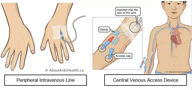 Children with medical complexity may be discharged from hospital to home and community with needs for long-term intravenous therapy such as medication administration, parenteral nutrition, and hydration. Intravenous therapies are administered through vascular access devices including peripheral intravenous lines (PIV) and central venous access devices (CVAD).