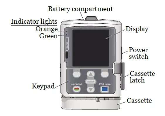 Keypad: The keypad allows the user to start and stop the pump, navigate through menus, change programmed delivery settings, and request a PCA dose (if applicable).